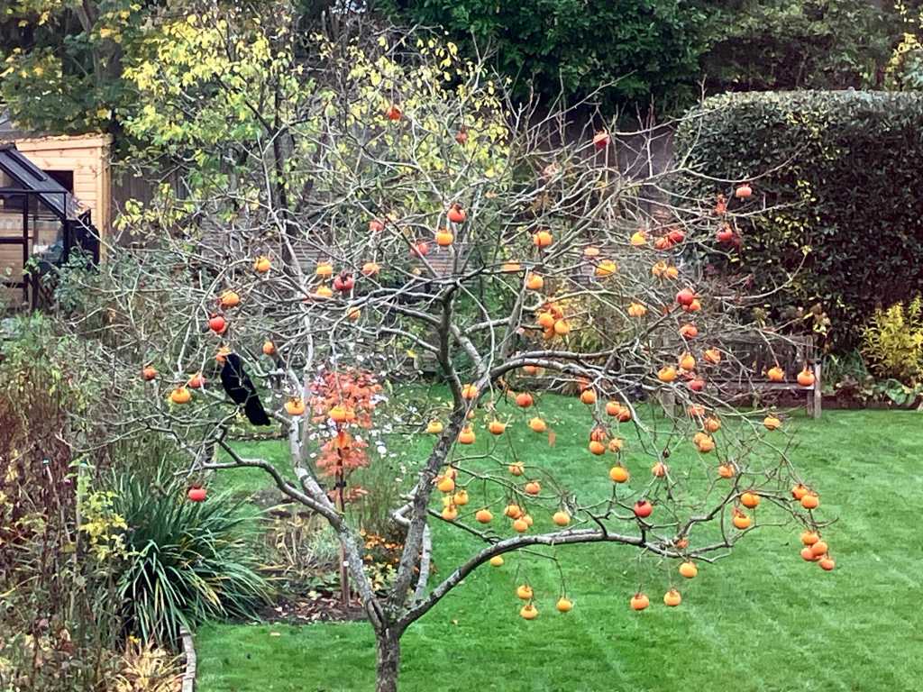 This was the persimmon tree in November. It seemed to ripen a few weeks earlier this year. The black blob in the branches is a crow. We usually see flocks of parakeets feasting on the fruit but the crows took a fancy to them this year and seemed to scare off the parakeets.