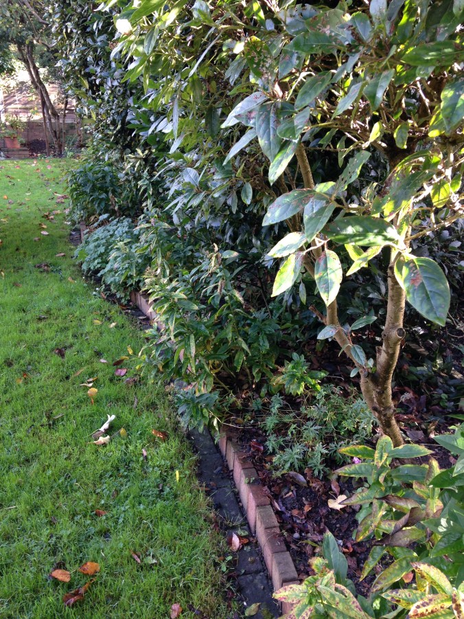 Here’s the border before work started. It was a narrow strip running in front of a hedge of bay, viburnum and elaeagnus. It is planted with geraniums and phlox which are all jostling for space and light under the hedging. Something needed to be done but I’m the sort of gardener that never manages to lay down a paper plan. The thought process was: this border needs to be wider, I saw a lovely rose at a garden I visited, I have a large pot that would look good there and those other plants can be brought forward to give them some space. Oh and tulips are needed. That’s a plan. Let’s go!