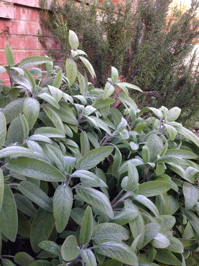 Shaking the snow from the plants is a necessary task. Left too long heavy snow will bend the branches downwards and some may snap. Cold wet hands have to be suffered but the positive was the delicious aromas released when I shook the snow from this sage and rosemary.