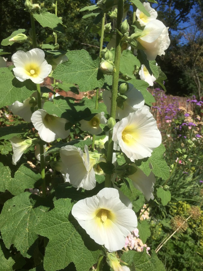 Well the hollyhocks seemed to have enjoyed the heat. These have been grown from seed gathered from the old allotment plot. I thought I had collected the deep burgundy ones. Last year’s seedlings came up yellow and this year’s are white. So far not a burgundy flower among them. But they are very impressive.
