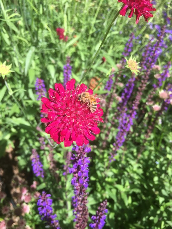 The knautia macedonica have burst forth and are humming with bees. They are just at the stage when I can cope with dead heading them – cutting out the first flowering middle stem is easy but a week on and I will be lost in a sea of new blooms and seed heads.