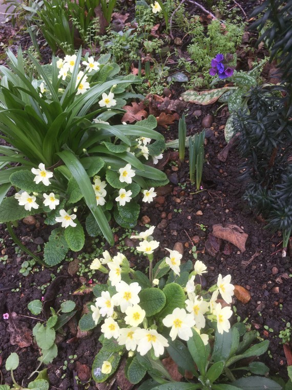The sun is out so I’m off to the garden for more photos! Some time later: The fig tree was pruned a few weeks ago but I was so excited by primroses, pulmonaria and such like that I didn’t show it. Hey, Mr P I also have wood chip! This the large fig tree that shades much of the long border in the summer. The height was reduced by a third and next year it will get another third taken off. I’ll lose the fruit this year but it needed to taken in hand.