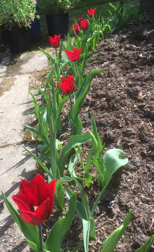 Speaking of waiting, I plan to have the poshest potato patch in N20. Following a tip from Tea Break Gardener I dug a trench along the edge of this year’s potato patch and planted it with a tulip collection. The first of four to appear is this lovely red one, ‘Sarah Raven’. They will be joined by ‘Mariette’, a brilliant pink lily shape, ‘Lasting Love’, triumph group, a pinky red and ‘Ballerina’ lilly flowered, orange of course.
