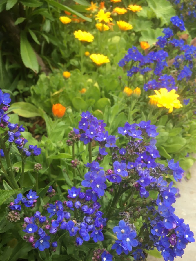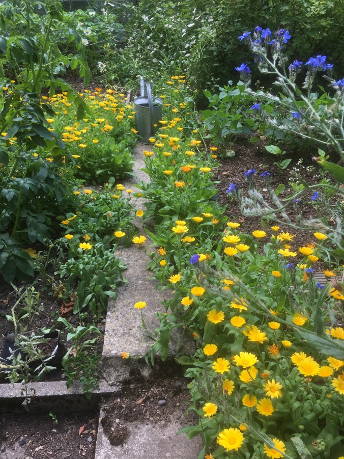 I have to share this view of the allotment end of the garden although it’s not to my credit. I had a few calendula plants in the garden a couple of years ago and if they are not ruthlessly controlled they run riot! Beautifully so, but I need to fight back. I’m enjoying the splash of colour for the moment but an afternoon spent pulling them out is on the agenda and next year I will be hoeing them off, immediately, no ground given. Honestly.