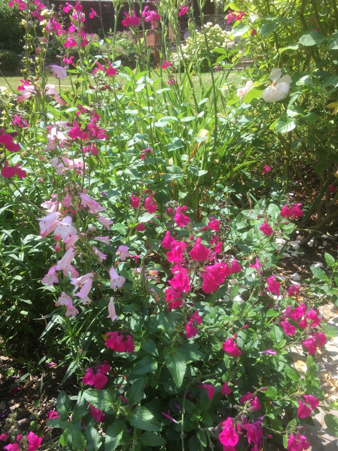 To finish I offer this combination of blackcurrant sage and a penstemon – could it be ‘Apple Blossom’? The sage looked a little sad after the winter but it responded well to a cut back and is now threading its way around the penstemon.