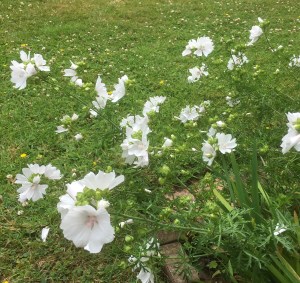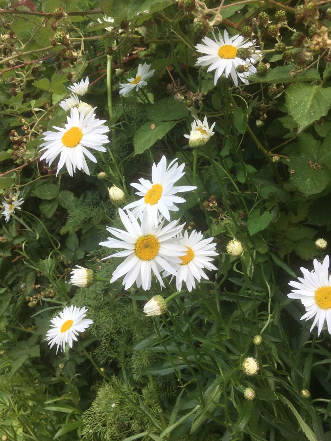 The cheerful Shasta daisies seem to be twice as high this year. They were started from seed about four years ago. They grow up into the wild blackberries that are another corner of the garden awaiting some attention. It looks like there will be a good crop there too.