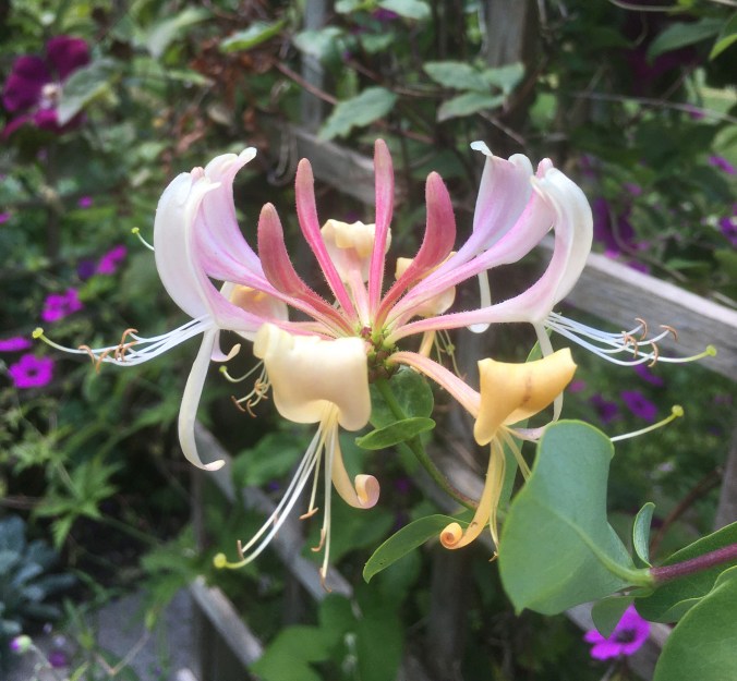 It is now four years since the move to this house and the garden borders are transformed. Each year a new corner or two comes under scrutiny. This year it was the passion flower draped arch and trellis. I could see that a honeysuckle also entwined its way around the uprights but it never flowered. One side of the passion flower has been taken down and the honeysuckle probably got a bit of a cut back in the process. Perhaps this is why it has flowered for the first time. It’s a great addition.