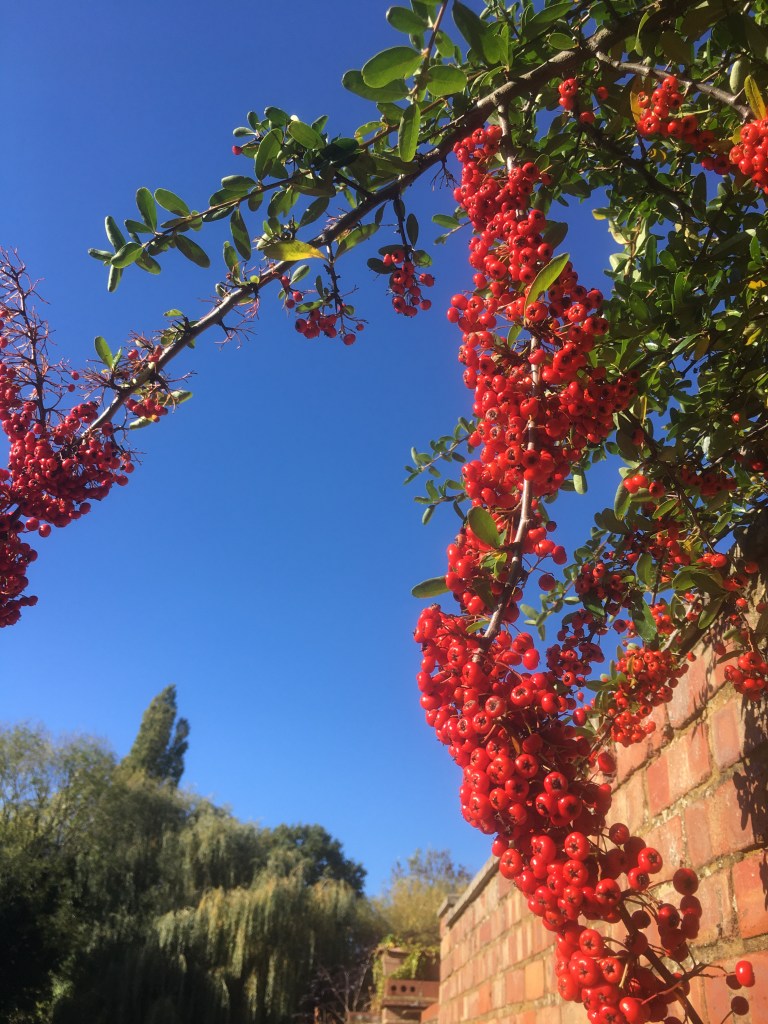 Last splash of orange for Halloween. The blue sky is a distant memory from last Sunday and the beautiful pyracantha berries are a reminder that there are still one or two plants on the wish list for the garden. These were growing outwards from a garden neighbouring the local park.