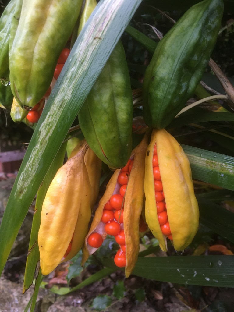 My next contribution to Halloween. The seed pods of Iris foetidissima are just beginning to open. The berries stay on the plant well in to winter, giving a good splash of orange to some dark corners of the garden.