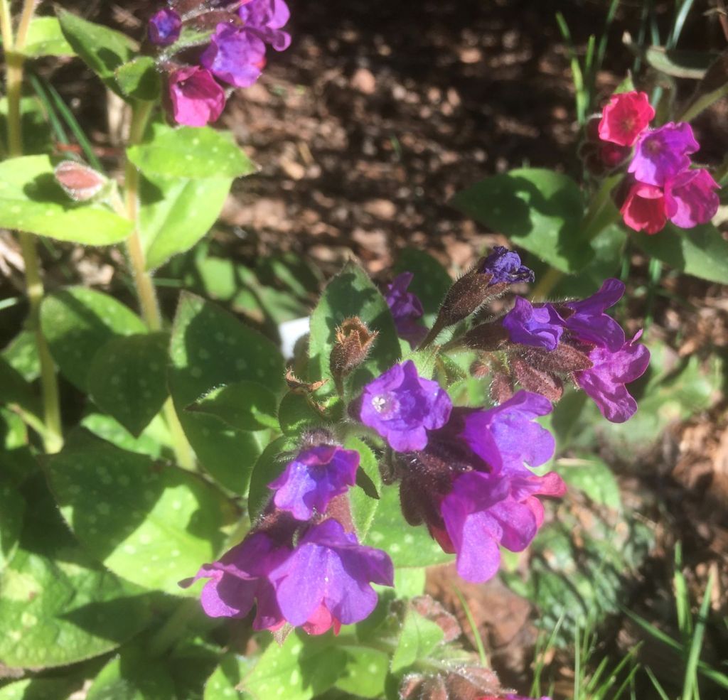 Pulmonaria, from a clump shared by a friend, dug up and divided many times since. There is always a little piece that remains in the original planting sight which doggedly sets off to clump up again.