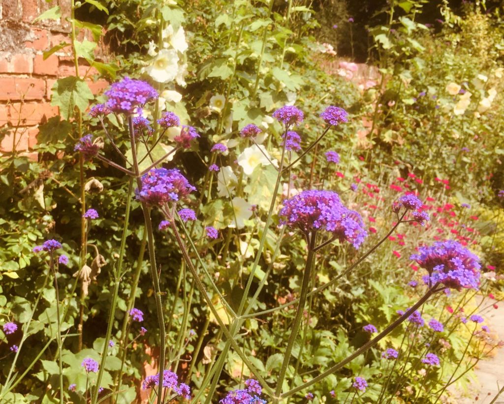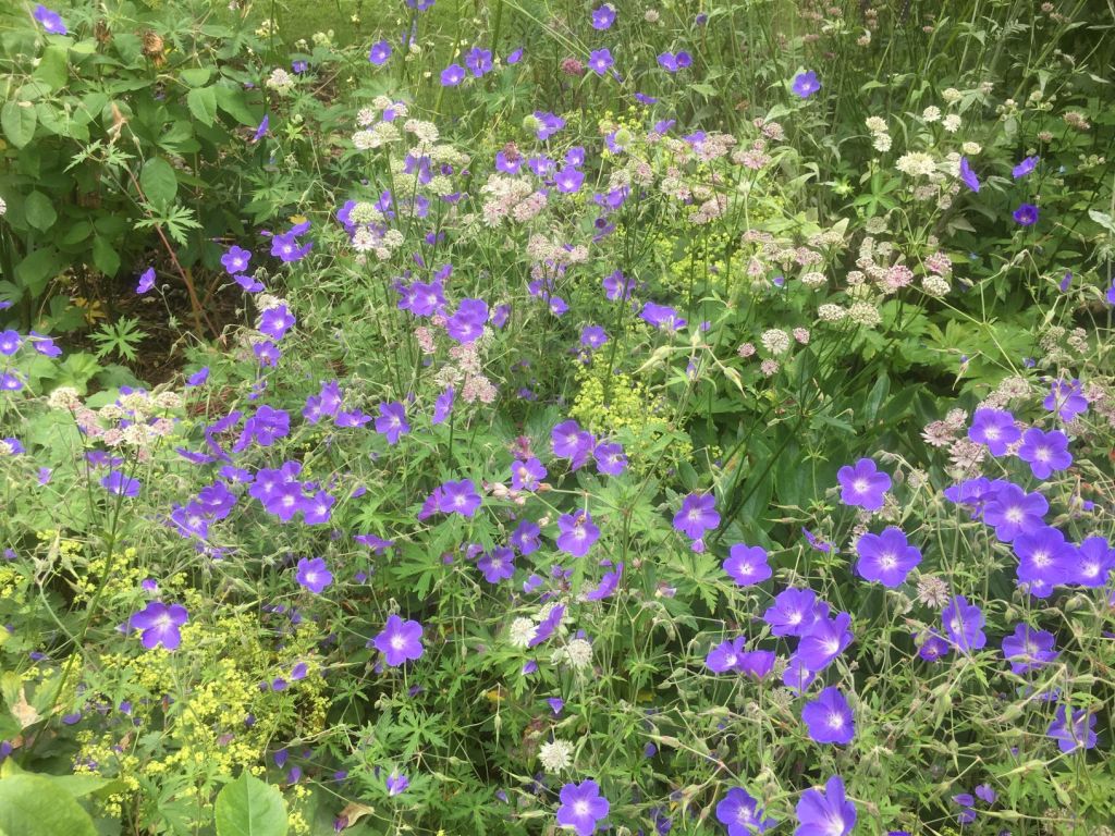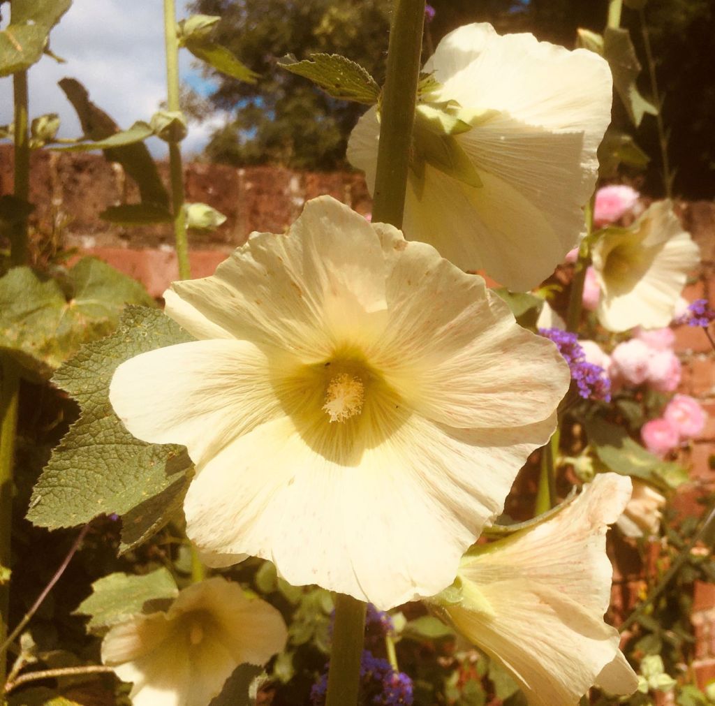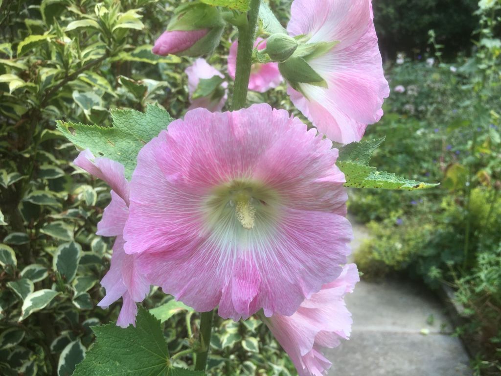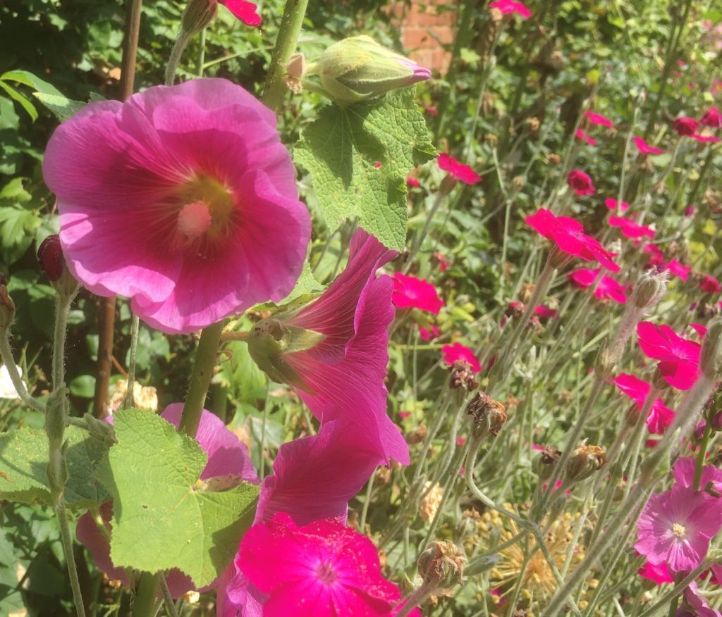 It’s never a good time to have a twinge-y knee but this mixture of plentiful rain and some sunshine has sent the garden and its weeds into overdrive. Storm Evert blew through yesterday and the hollyhocks were swaying about like seasick passengers on a cruise ship in roiling seas. I nipped out in between the downpours to take some photos. These give you a selective view of the garden. In truth the long border is mass of geraniums that are still waiting to be cut back along with knautia, alchemilla mollis and of course a good selection of weeds. Here’s the good side of the garden for this week.