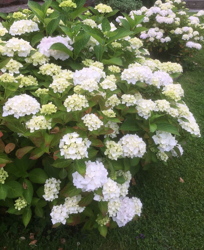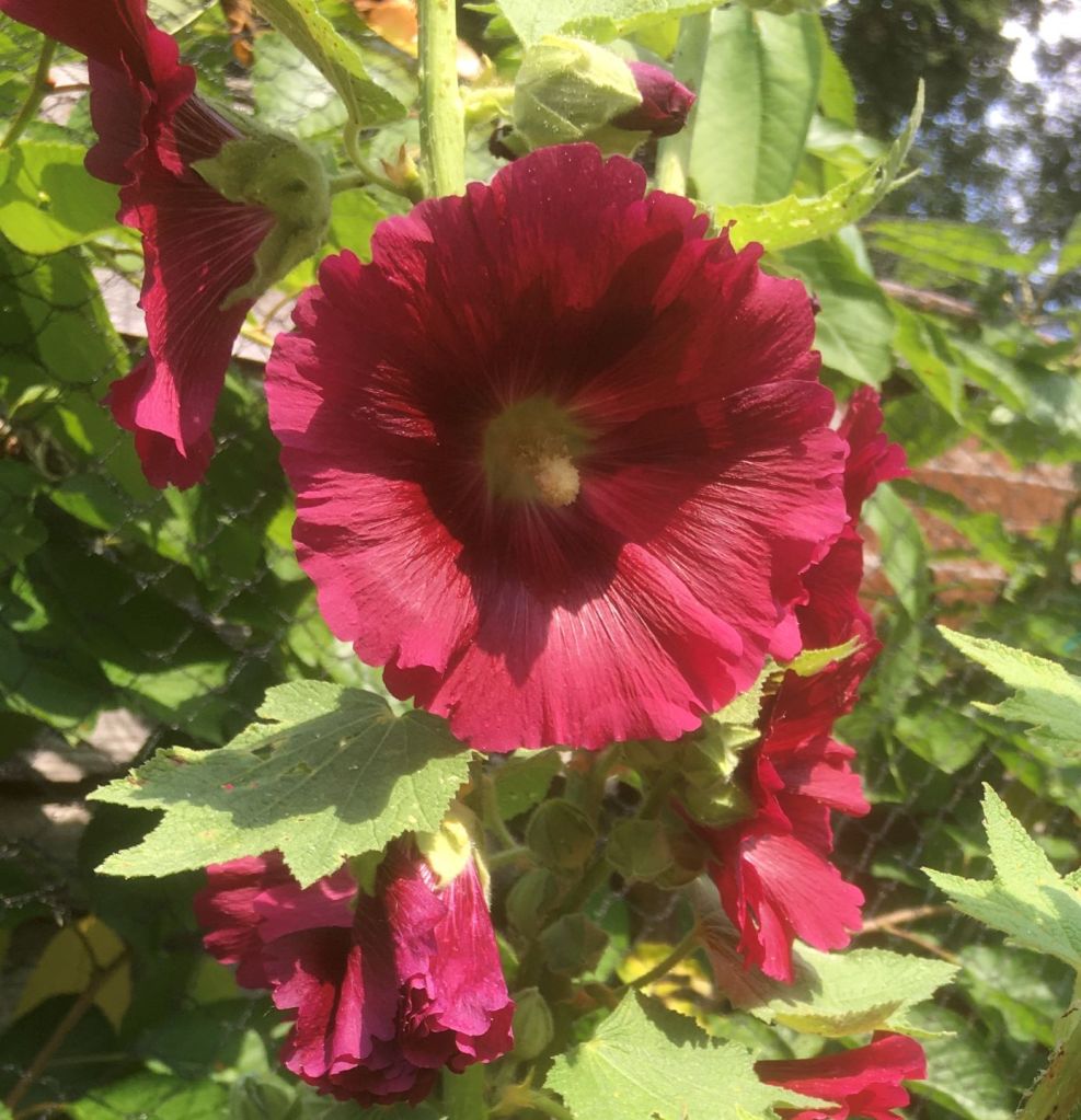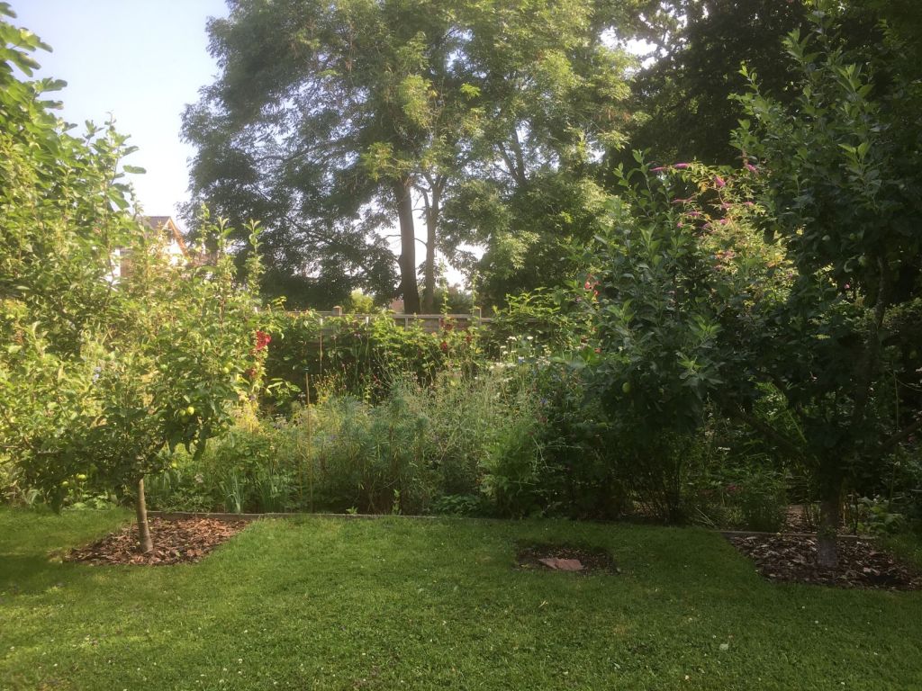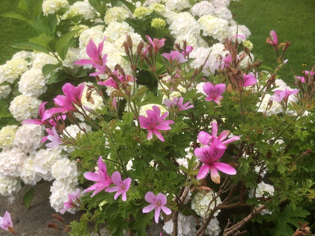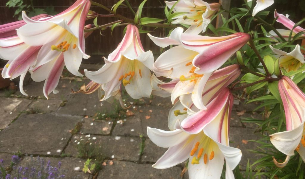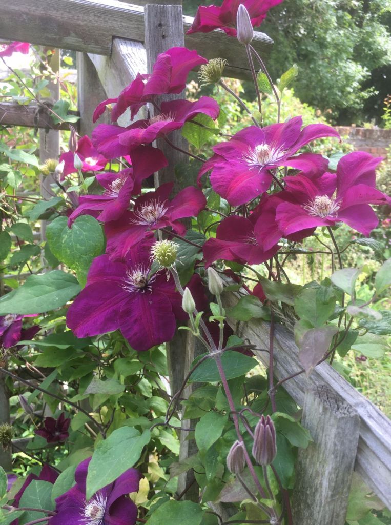 It’s never a good time to have a twinge-y knee but this mixture of plentiful rain and some sunshine has sent the garden and its weeds into overdrive. Storm Evert blew through yesterday and the hollyhocks were swaying about like seasick passengers on a cruise ship in roiling seas. I nipped out in between the downpours to take some photos. These give you a selective view of the garden. In truth the long border is mass of geraniums that are still waiting to be cut back along with knautia, alchemilla mollis and of course a good selection of weeds. Here’s the good side of the garden for this week.