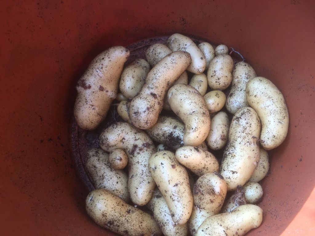 As posted earlier in the week on Twitter, the potatoes grown in a container were upended and the ever-pleasing job of rummaging for the treasure began. I grew Belle de Fontenay this year, which are classed as second earlies/main crop. Four small seed potatoes were planted in a 17 litre container which was half filled with compost. This was topped up as the leaves came through. I was very happy with the haul of 3kgs, some smaller but a good proportion were of a generous size. The best advantage of growing like this is that there’s no danger of leaving the odd potato in the ground to grow on next year. I might be a convert. I have two rows growing in the ground which will be dug up as and when needed.