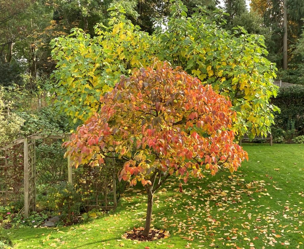 The fig and the persimmon leaves are changing colour. The persimmon crop will ripen in December and is a winter donation to the birds. The figs often deliver a few fruit in November as a bonus crop but this year they look rather small and will probably not be worth harvesting. The fruit does still need to be picked, leaving on the tree only the smaller pea sized fruits for next year. This is one of my least favourite autumn jobs, so many fruit and some that are completely out of reach.