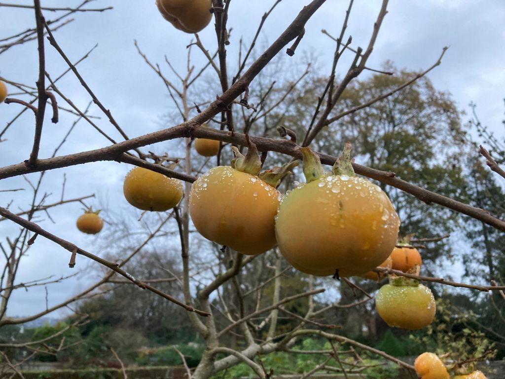I think this is the cheeriest of the six! The annual reveal of the persimmons. I was surpised to have any this year after the number that dropped in September. But here they are again and the parakeets have been squawking around letting me know that they are almost ripe.