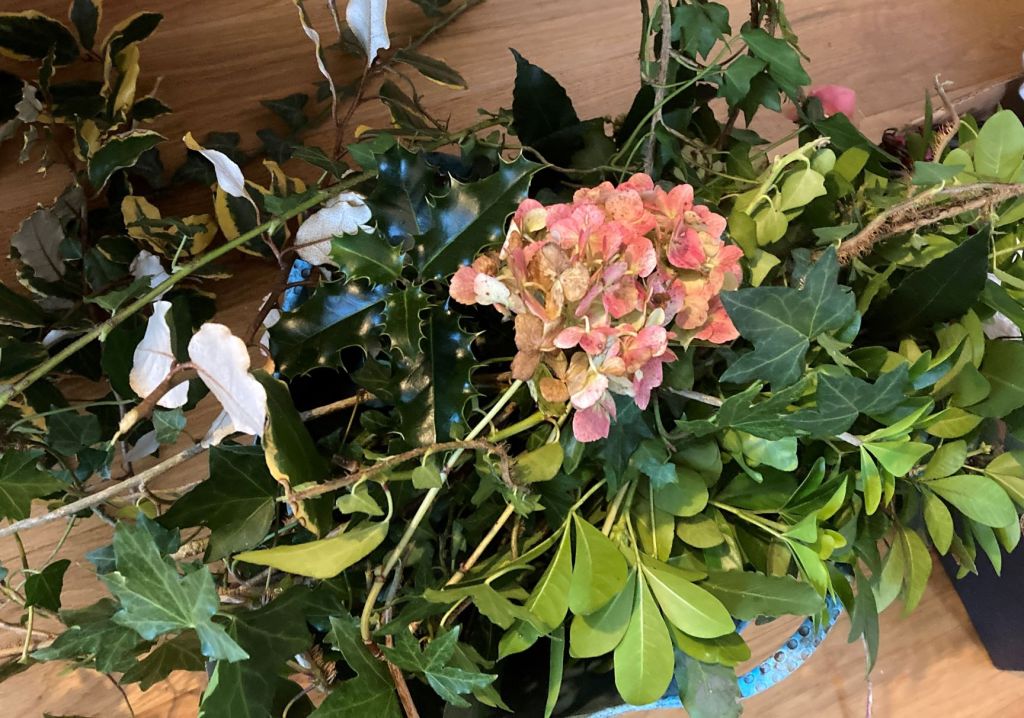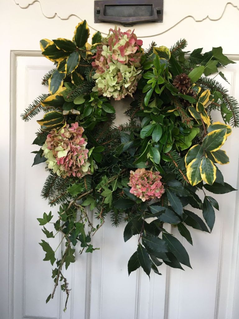 Some hours later…this year’s Christmas wreath. Using Spruce, Bay, Ivy, Holly, Choisya, Elaeaganus and Hydrangea flowers.