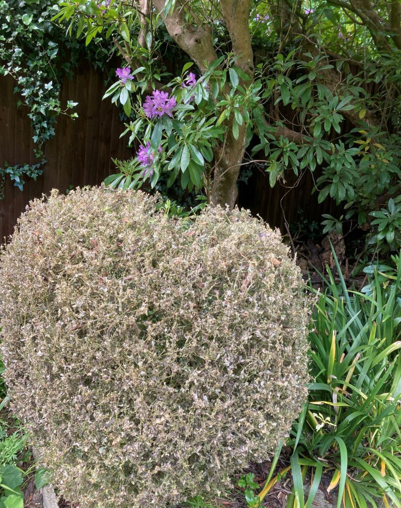 Time for the poor box. Buxus sempervirens (always vigorous) it is not. Box moth caterpillars have truly taken hold of it and it is time to take it out. The first picture was taken a few weeks ago and the second is its current sorry state. Quite shocking! The box sits under the very vigorous rhododendron, so finding a replacement will be interesting but I am currently thinking of a fatsia japonica.