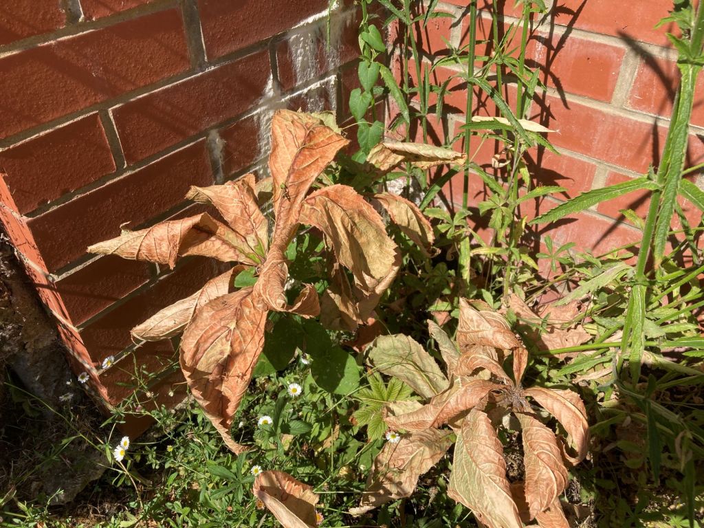 The rodgersia, planted in the ‘damp’ corner of the garden, next to hydrangeas and siberian irises. I think I might call this one dead, even though there is one small green leaf showing through. I have a sun-loving hebe that is sitting it out on a corner of the veg patch. This could be its moment.