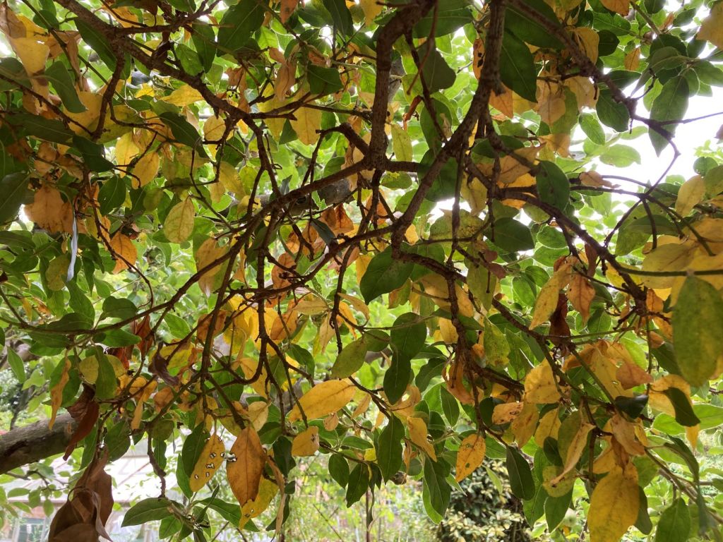 The leaves on the viburnum tree are yellowing and dropping off. It has to compete with a nearby apple tree and tough luck at the moment for anything trying to grow beneath them both.