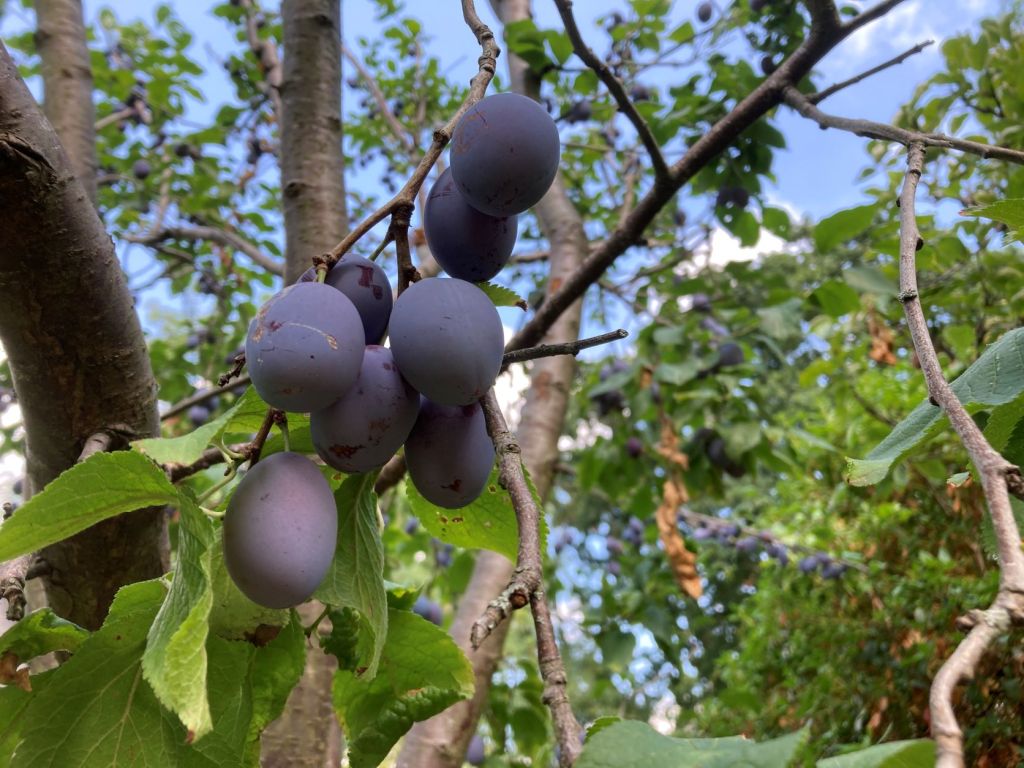 It’s a good crop of plums this year. Variety unknown. As is common, they are suspect to plum moth so the early ripening fruits often have those darling maggots. This means that each plum is cut in half and checked over before use or more usually before freezing. That’s another job for the weekend.