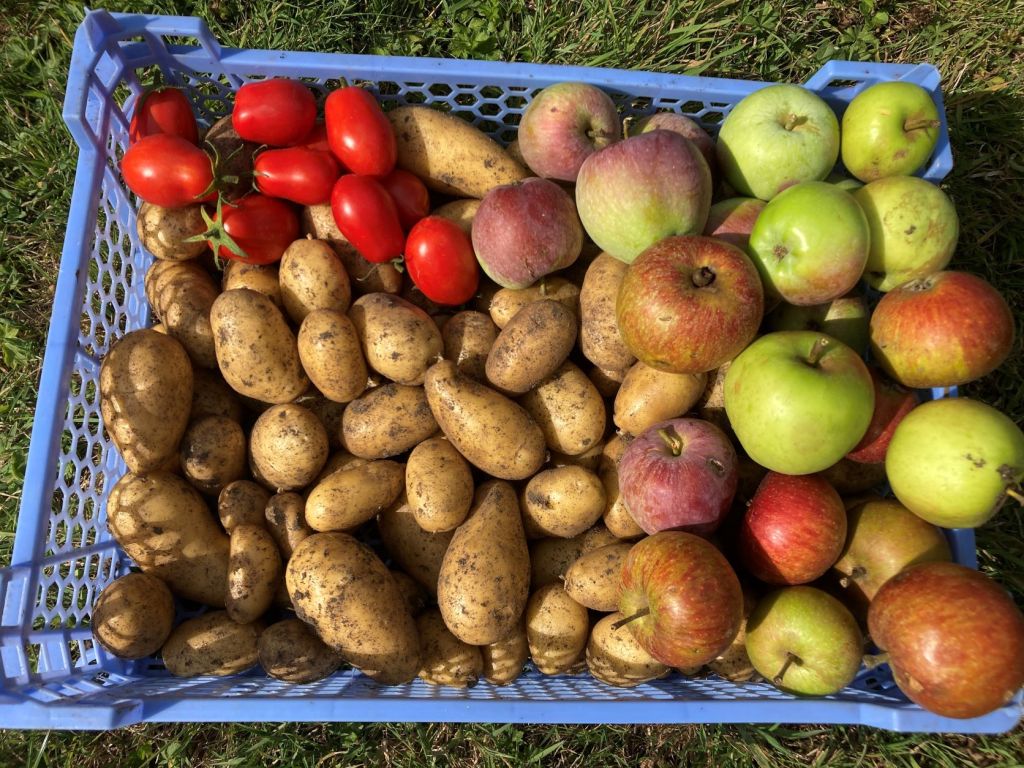 I’d left my ‘Jazzy’ new potatoes in the ground, digging them up as and when needed. After the heavy rain of Thursday morning I thought I’d better dig them all up for fear of leaving in them the soggy ground. A few forks in revealed that the surface was nicely damp but down below things were still pretty dry. I did dig them all up, collected a few windfalls and picked the outside San Maranzo tomatoes. These are so much smaller than those in the greenhouse, but appreciated nonetheless. The potato haul was 8kgs, which I am more than happy with.