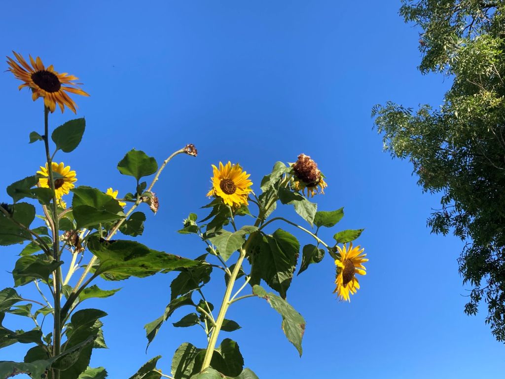 One way or another I always seem to end up with a packet of sunflower seeds and for no reason at all I usually sow a handful. This year’s plants have grown to heady heights, loving the heat and somehow drawing on a secret supply of water. They are going to seed now and have been tracked down by the local parakeets who are managing to balance on the flower heads and are feeding excitedly on the seeds.