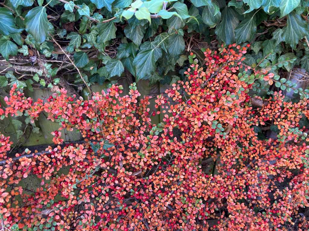 It’s that time of year when I roll out two old favourites. I always think of fellow SOSer Off the Edge when I include this one. It is not her favourite plant – cotoneaster horizantalis. But it puts on a good show, provides food for the birds and I have grown to enjoy it.