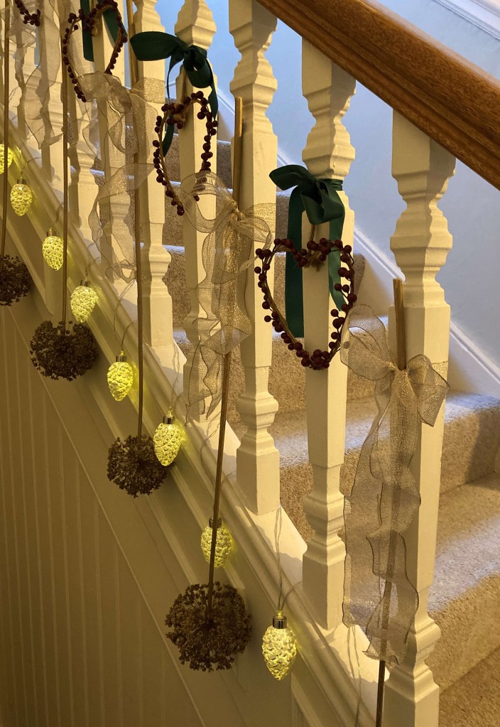 I usually bring in plenty of ivy and other foliage to make a garland for the stairs but this year I have gone very minimalist and used allium seedheads sprayed gold and combined them with some other bits and pieces and a string of snowy pine cone lights. There’ll be less to clear up come the New Year!