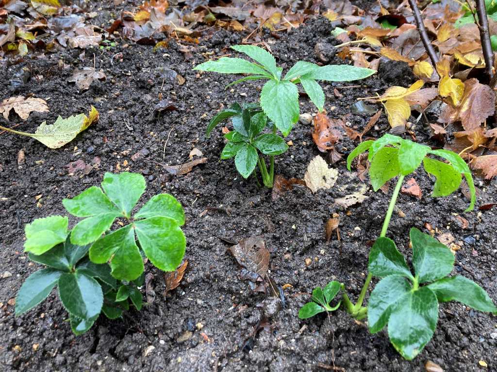 The old leaves of hellebores have been cut back and new ones are coming through.