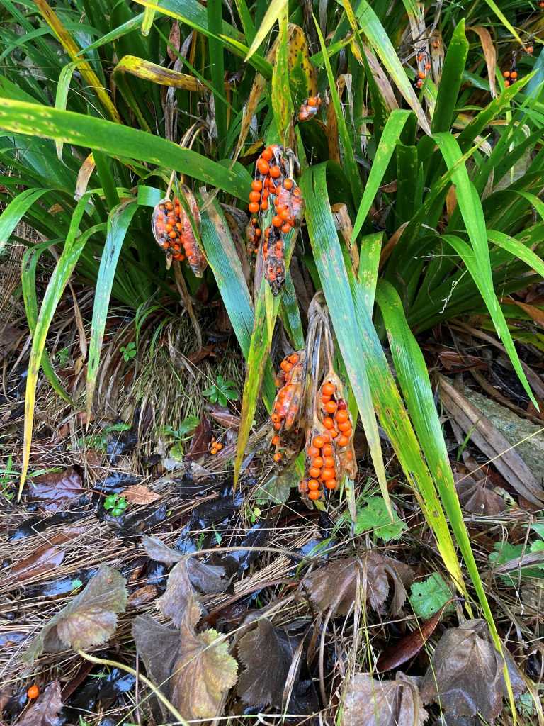 There’s not much colour in the garden but the seeds of iris foetidissima are just about holding their own against the rain.