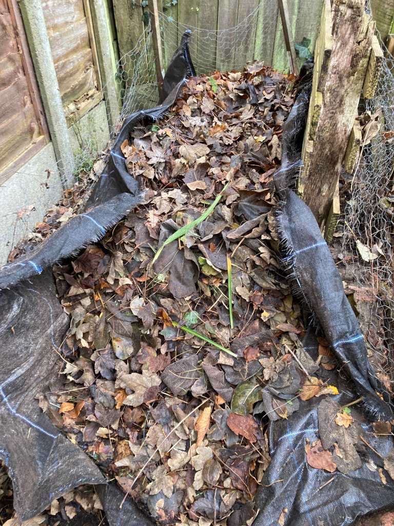 The leaf mould cage is back in action. It’s been in use for about five years now and sadly the original posts used for the corner supports are rotting but there are just enough left standing to do for another year.