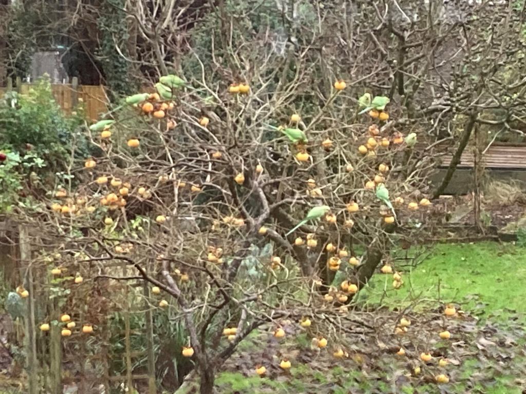 To end, a grainy photo of the parakeets and persimmons taken through the kitchen window. A bizarrely exotic site for a gloomy garden.