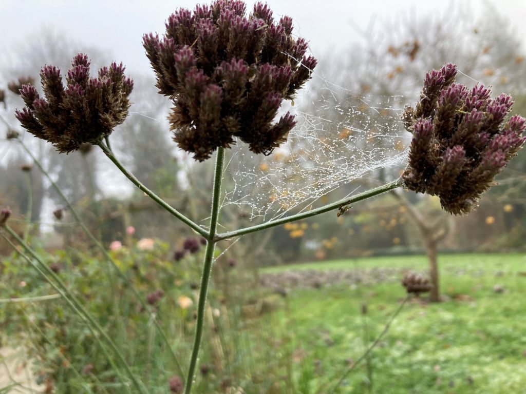 Cobwebs on the verbena. These are left standing for the goldfinches who come for the seeds.