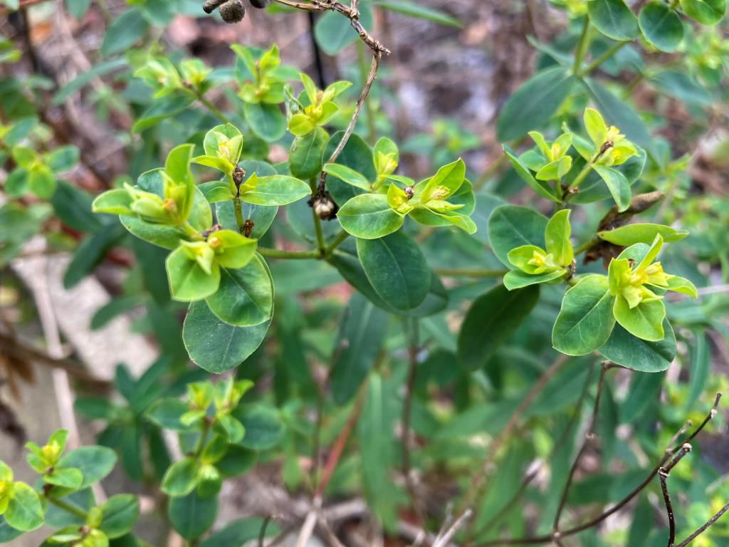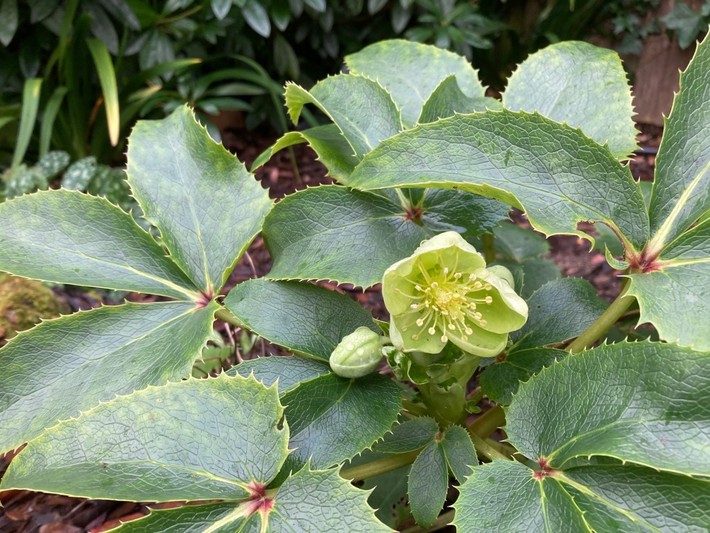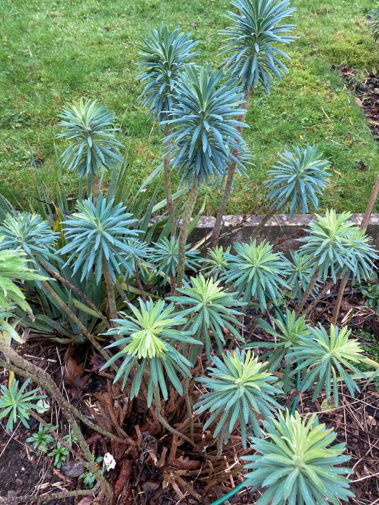 We had a very large tree taken down about a year ago and having had so many storms since I am very glad we did remove it. I have seen two trees in local front gardens that have collapsed in the high winds. One landing on a car and one just missing. Half the trunk of our tree was ground out and euphorbia robbiae seemed a good option for a dry inhospitable place. It’s doing well, of course.
