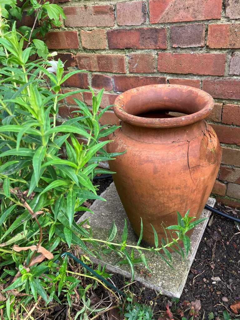 Here’s the frost shattered pot in its new home. Against a sunny wall, perhaps it will survive another winter more or less intact.