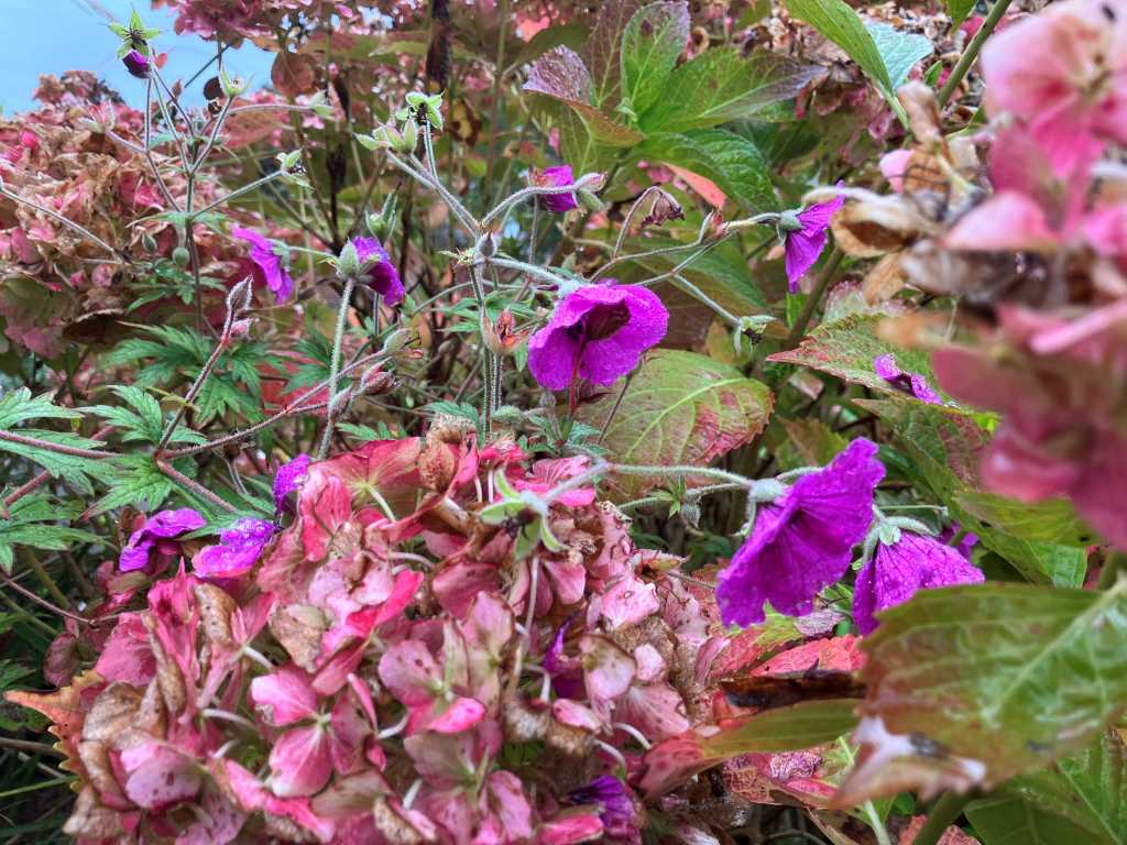 The hydrangeas are really putting on a great autumn display, the colour deepens every week and this week the re-flowering geranium psilostemon clashes rather well.