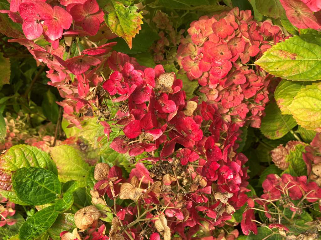 The hydrangeas are rapidly changing colour and this one has chosen the perfect autumnal red.