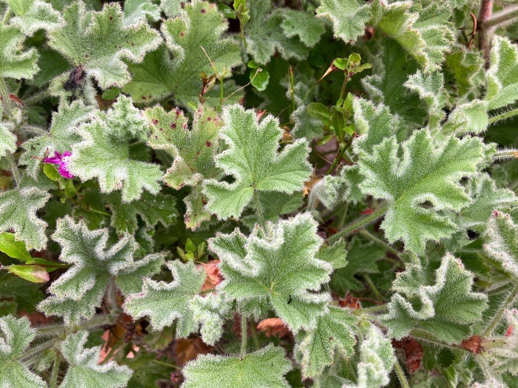 The heavy dew has left delicate edges on the scented pelargoniums. A visit from the greenhouse retailer confirmed that I will be without a greenhouse until January. Now what am I going to do with eight pots of tender pellies? I’ll be squeezing some into the shed and hoping.