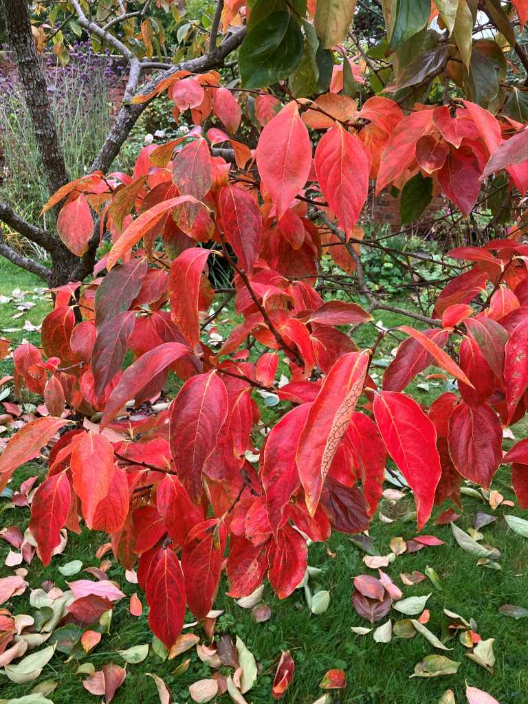 The leaves on the persimmon tree are turning beautifully shades of red. They don’t last long before they fall to the ground. This is the cue for starting up this season’s leaf mould heap.
