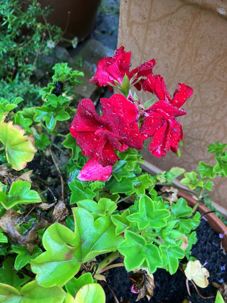 I upended the summer bedding a few weeks back but the pelargoniums looked as if they could take a few more weeks so I potted them on and they have dutifully put out another round of flowers.