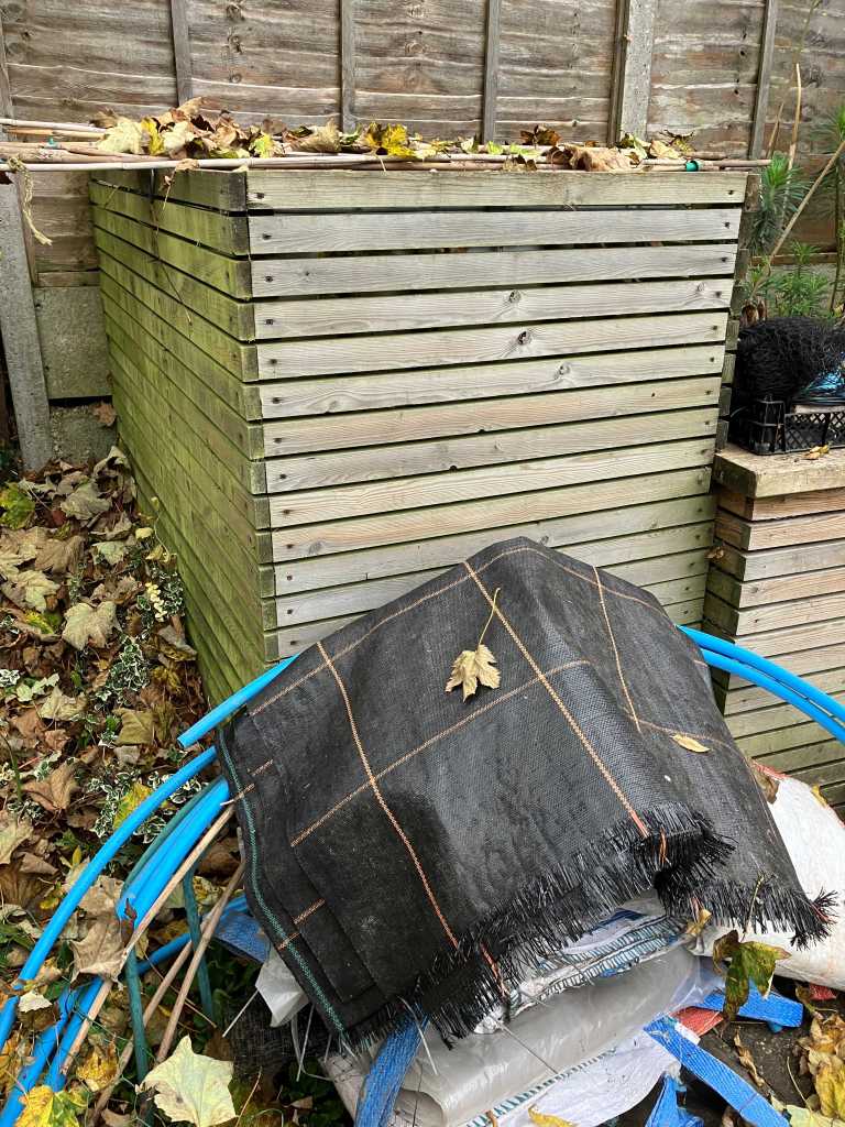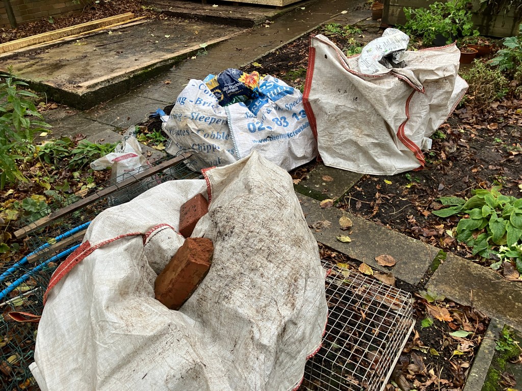 And today they were put to good use, weighing down the builder’s bags that hold the collection of plastic pots, netting and seed trays that came out of the greenhouse.