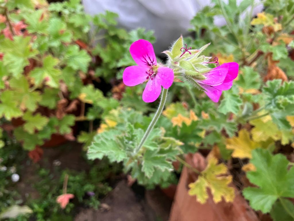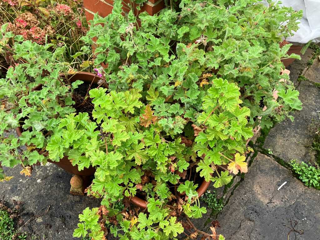 I still haven’t had time to take the scented leaf pelargoniums inside so they have been huddled together against the winds. Next week is mild so they will good for another week outside.