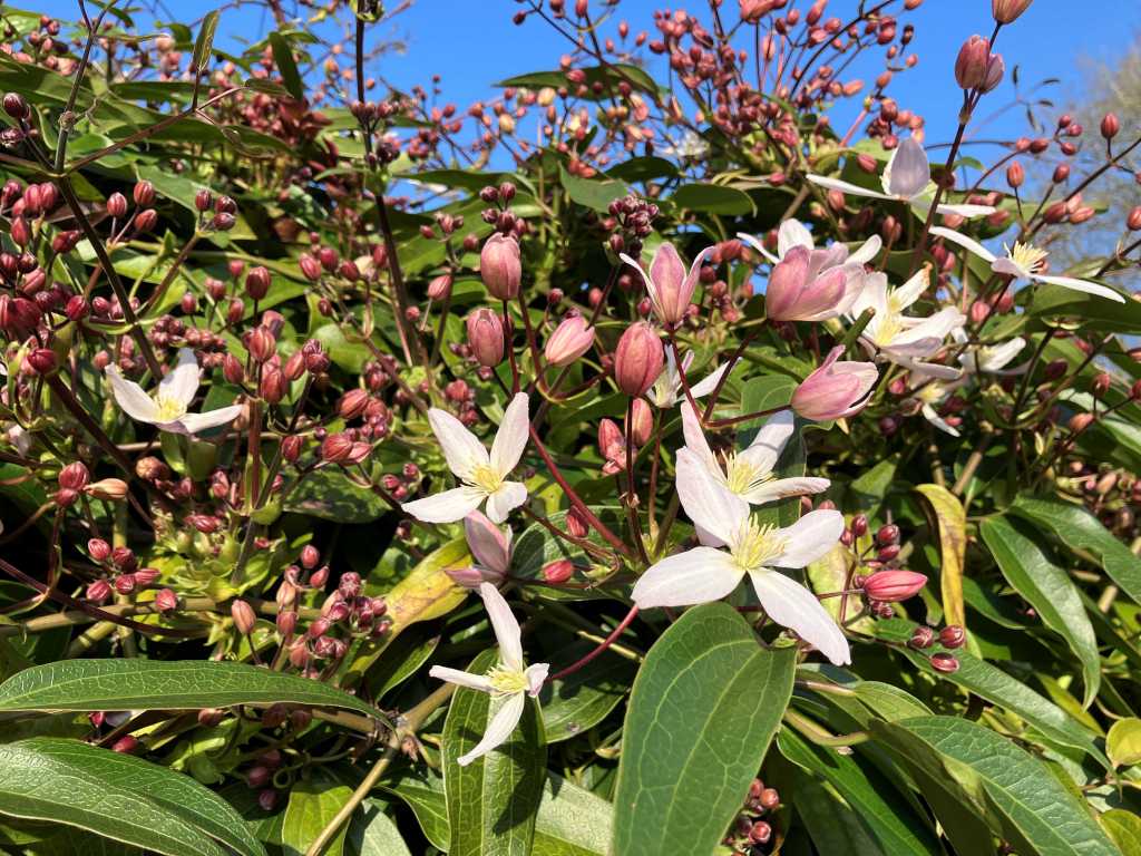 I had to snap of photo of the clematis armandii on a blue sky day. It’s the ‘Apple Blossom’ variety. This is definitely a sign that Spring is here.