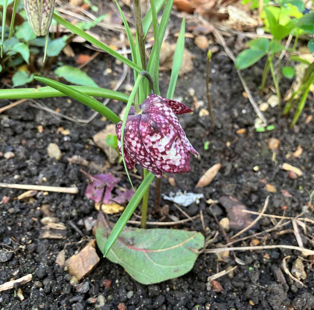 The very first of the fritillaries, very low down at the moment, it will probably be eaten by slugs by the end of the weekend.