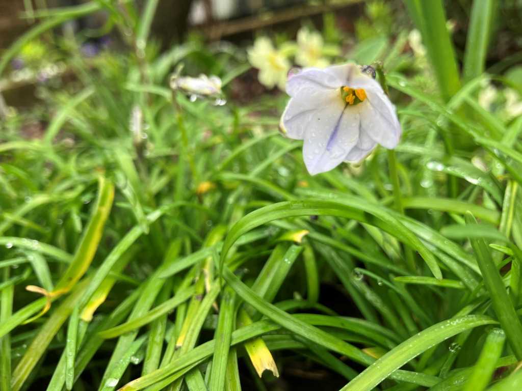 The first flower of ipheion, the spring starflower, also opened and was then drenched by rain.