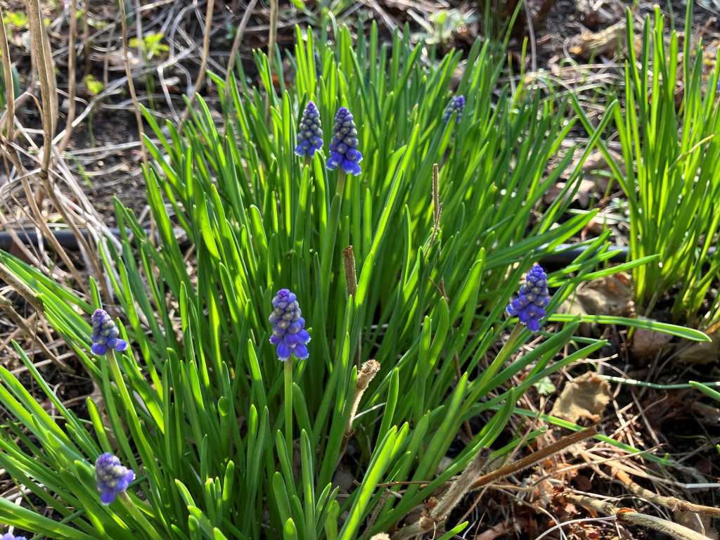 Just opening up, the various clumps of muscari that are dotted along one border. These have been in for a few years now and are beginning to spread which is fine by me.
