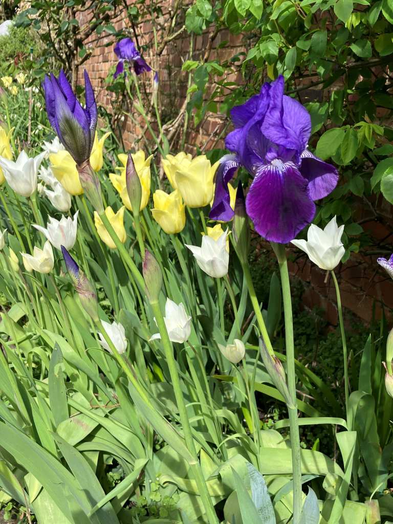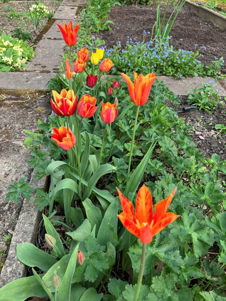 The early ‘Negrita’ tulips have been joined by ‘Spring Green’ and one or two ‘Ronaldo’ These have lasted extremely well, in their third or fourth year I think. I hope that doesn’t jinx it.