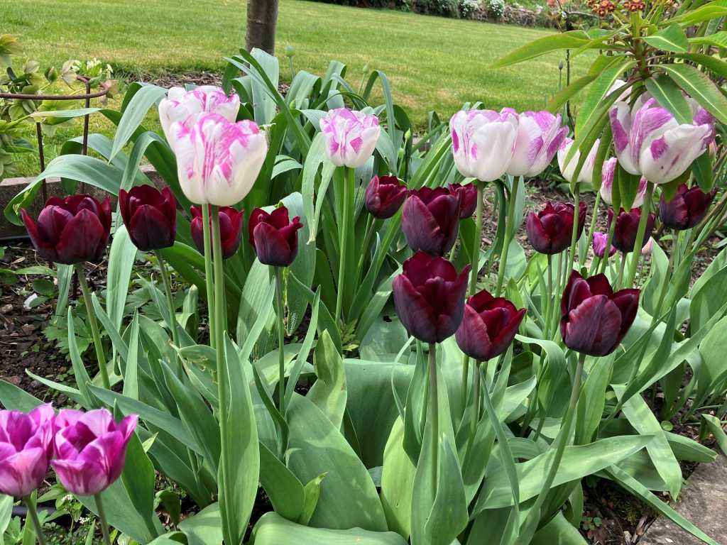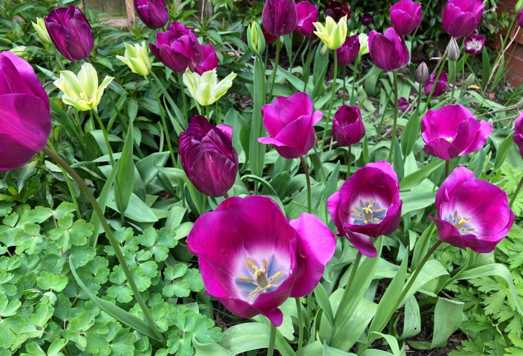 These are some of the first tulips I planted in the garden about nine years ago. Have they all lasted all that time? I’m not sure, I know I have added to them over time. The combination is ‘Queen of Night’, ‘Shirley’, and ‘Barcelona’.