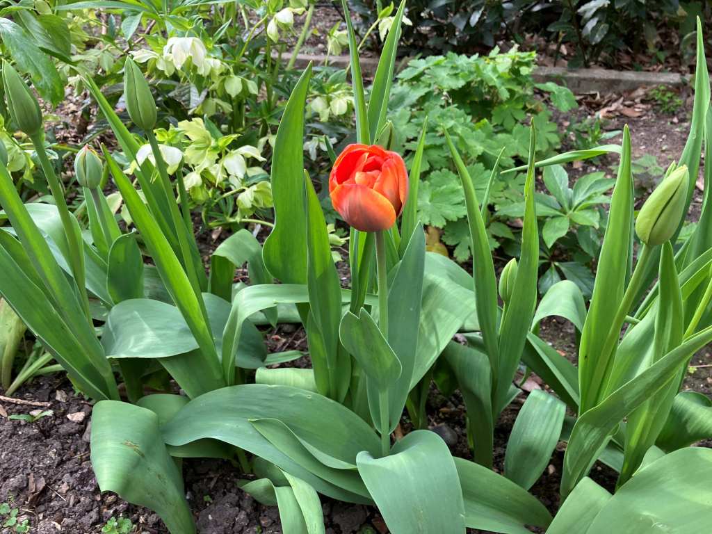 Here’s the oddity of the week. I ordered 40 ‘Maureen’ tulips to fill a gap in my otherwise splendid row of these white gems. This is the first of the new batch to open and it is clearly not white. I think about 3 others will also open up orange. Not what was planned. I will post again when the real ‘Maureens’ have opened, it could be quite a contrast.