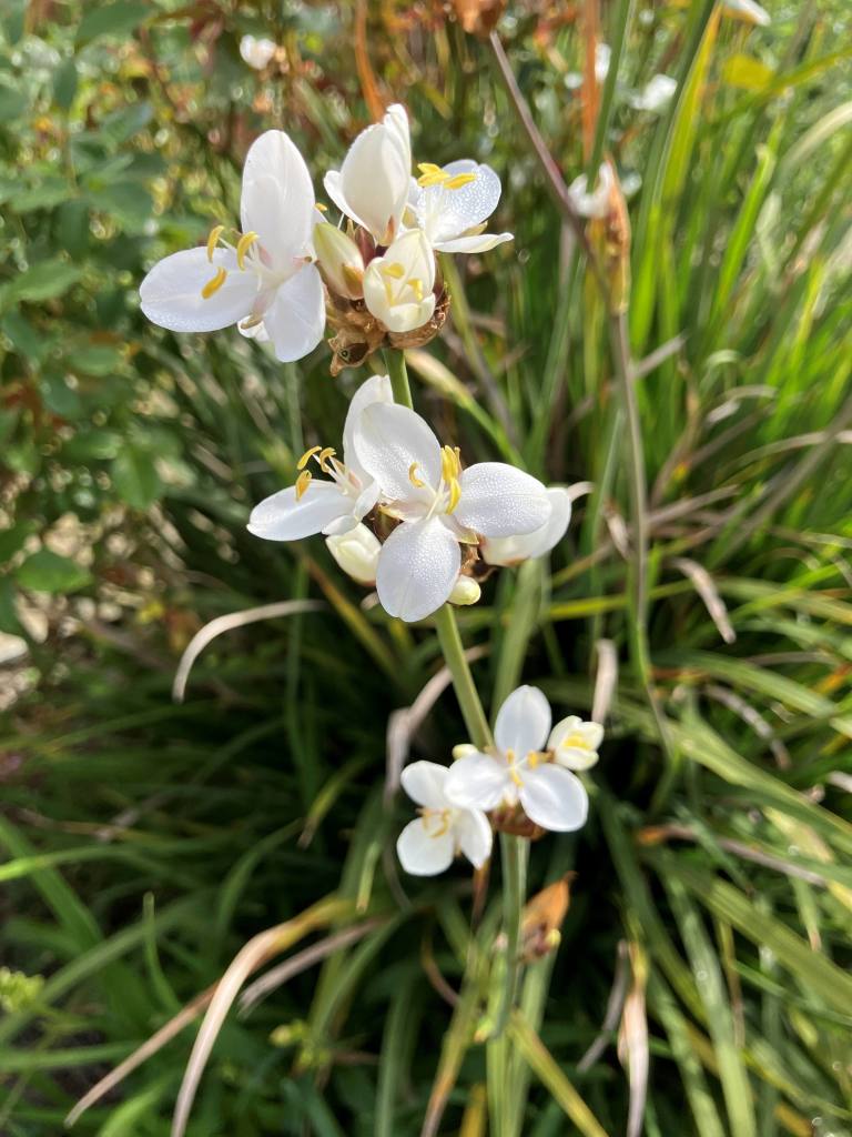 Libertia grandiflora. I added four of these to the garden after seeing them at the Olympic Park in London. Of course that’s a vast space and I saw them in their early years. I certainly hadn’t anticipated how much they would bulk up. A couple of years ago mine were dug up and re-distributed around the garden. They are evergreen and give some winter structure and at this time of year the lovely flowers held on long stems are very attractive.